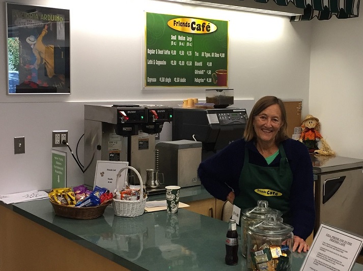 Our Popular Cafe is a cozy and sunlit enclosed room on your left as you enter the library. It features a manned coffee bar with packaged snacks and cold drinks; a plenitude of newspapers and magazines; comfortable armchairs; Wi-Fi; work tables that provide plug-in connectivity and conversational privacy; and a sonorous wood piano.